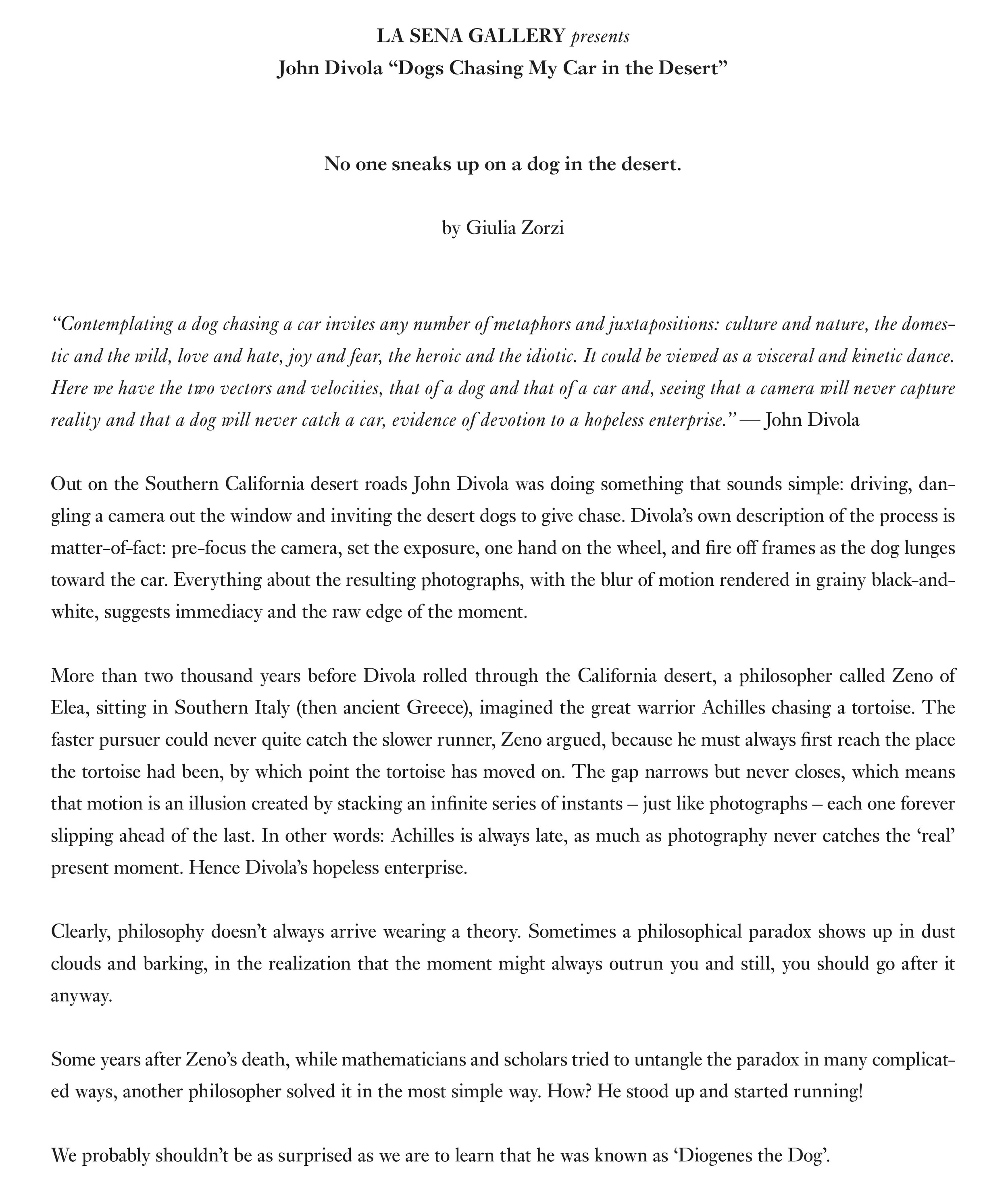 John Divola: Dogs Chasing My Car in the Desert 11/22/25-1/15/26 Slide 1 Slide 1 (current slide) Slide 2 Slide 2 (current slide) Slide 3 Slide 3 (current slide)